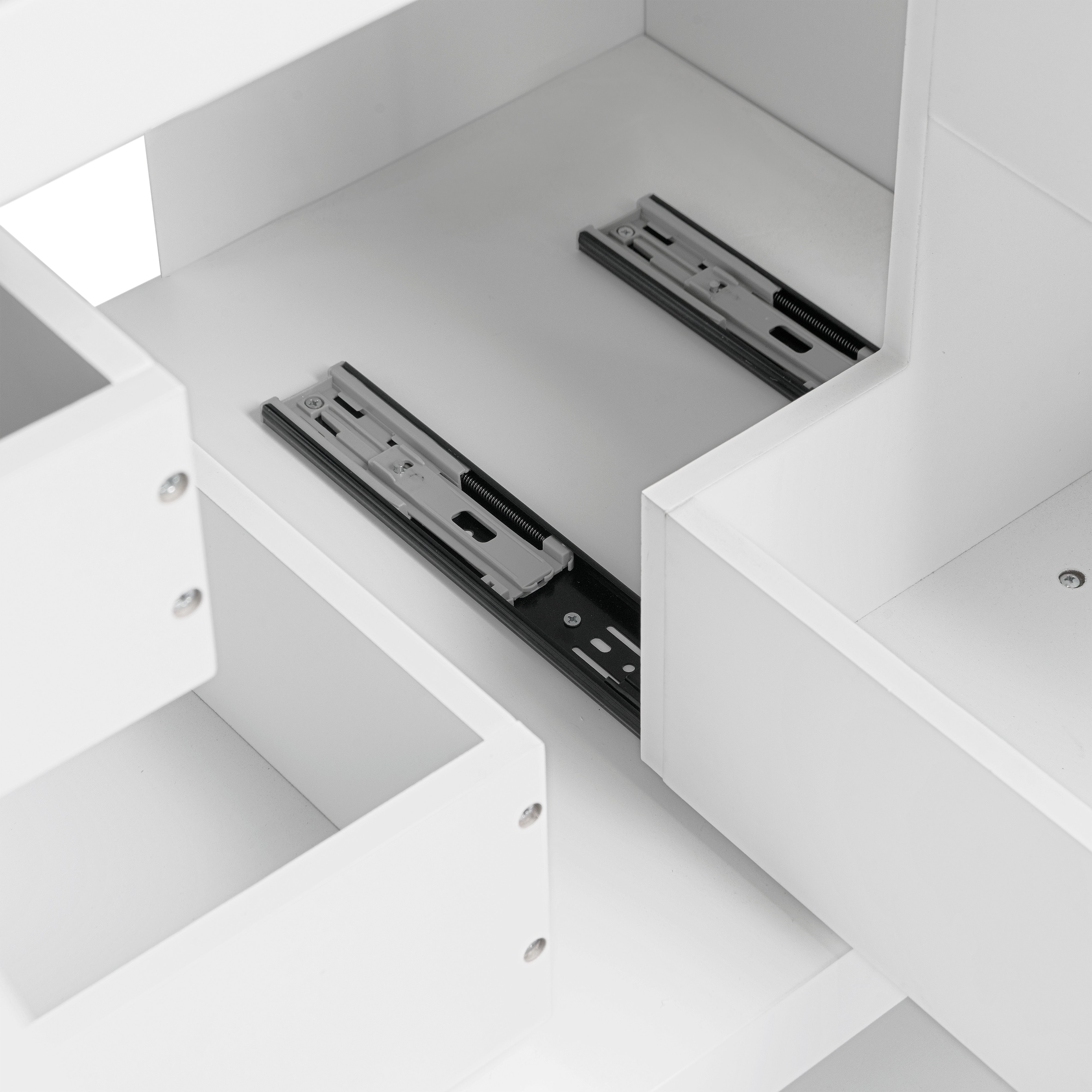 Multi-functional Drawers: This vanity cabinet inside is designed as functional storage: two drawers with slides underneath can be pull out and in, which is convenient for you to take stuff. Moreover, each drawer has two up and down parts to place necessities in different size.