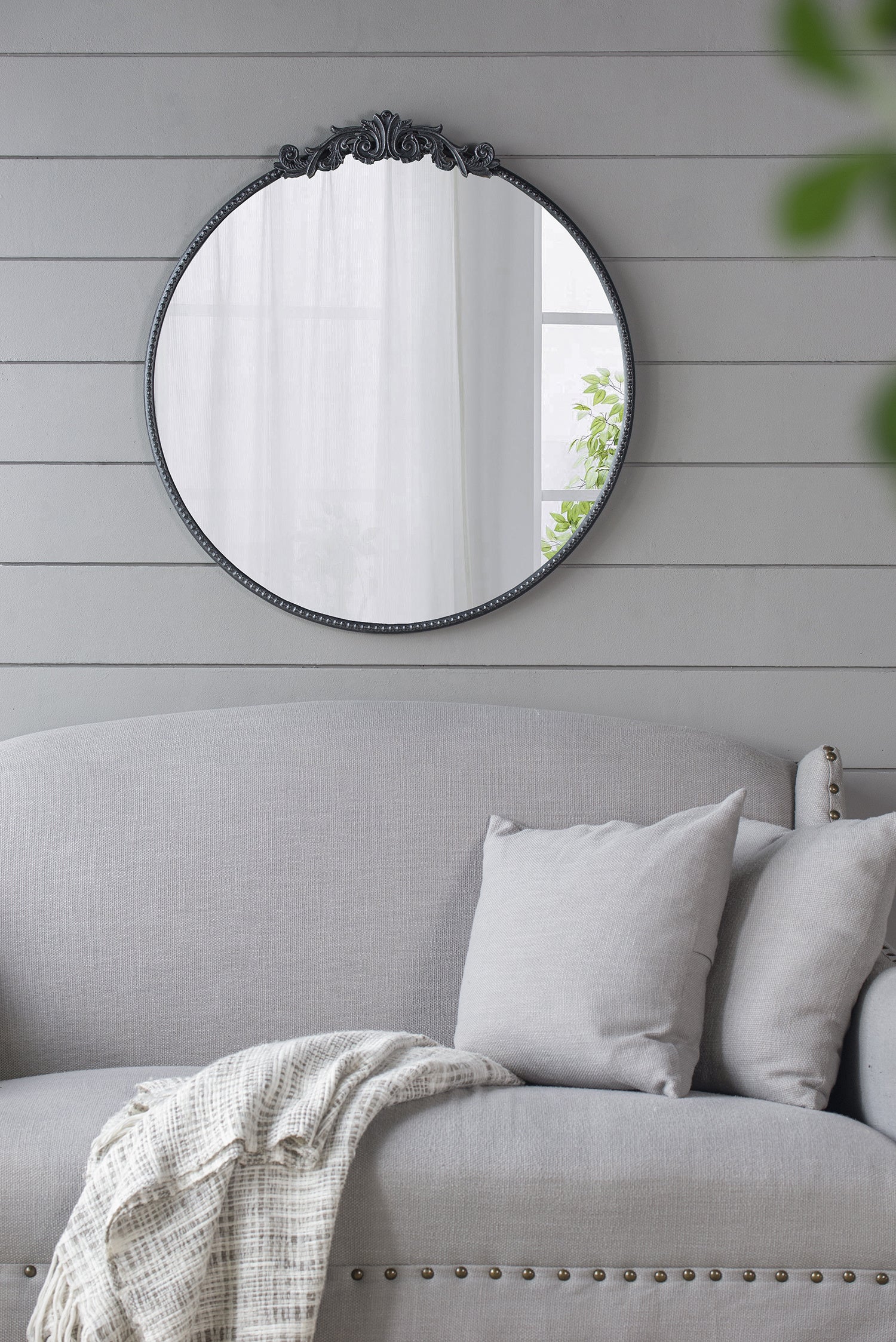 The classic round mirror with the gorgeous adornments on top that gives a vintage inspired look