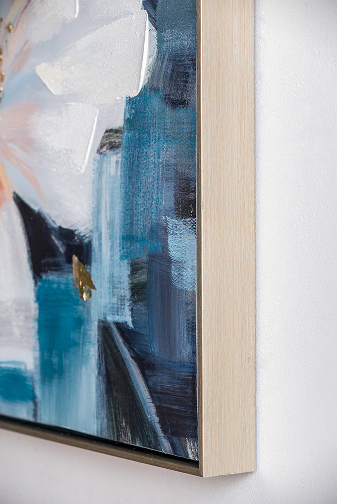 Features muted deep blue ivory and soft pink tones