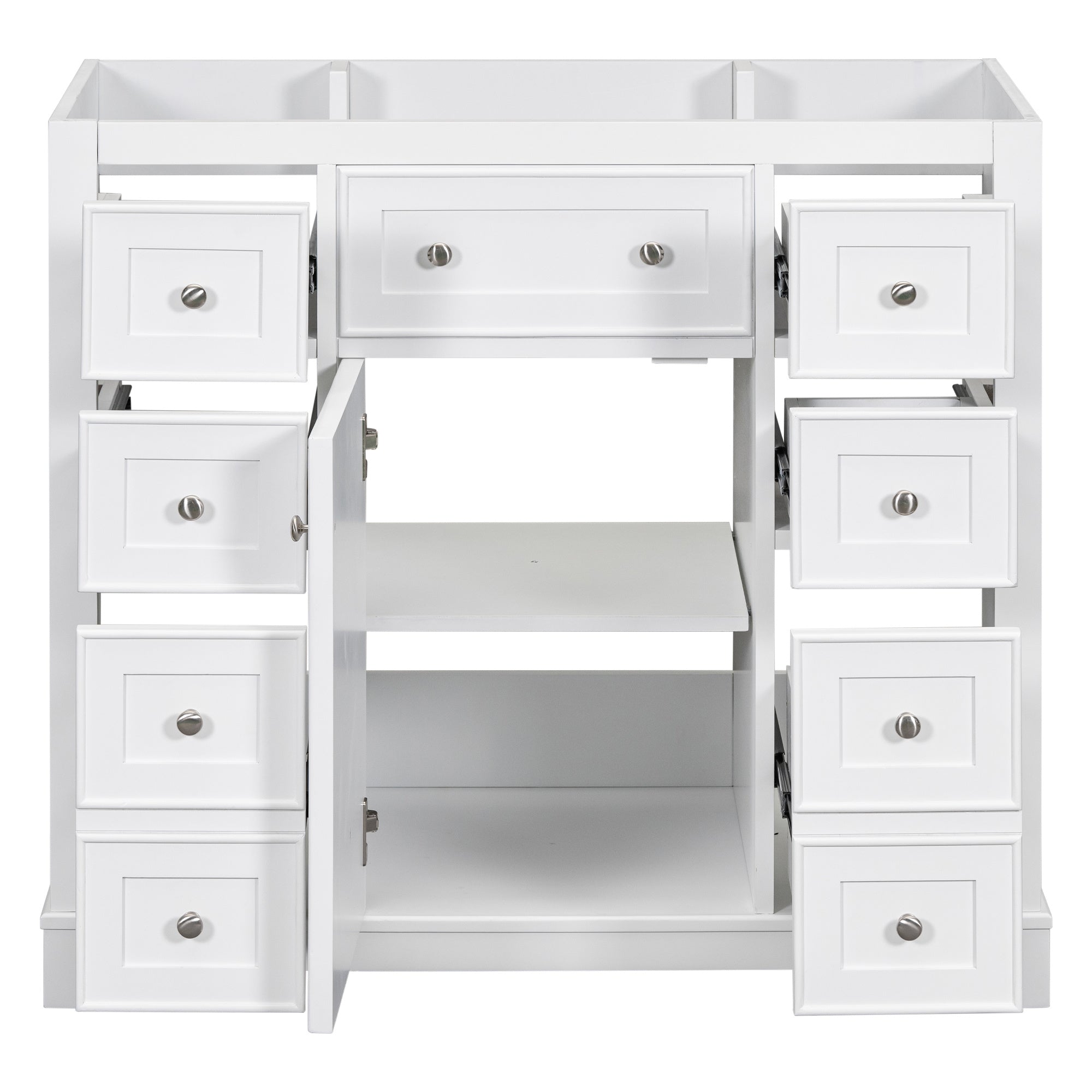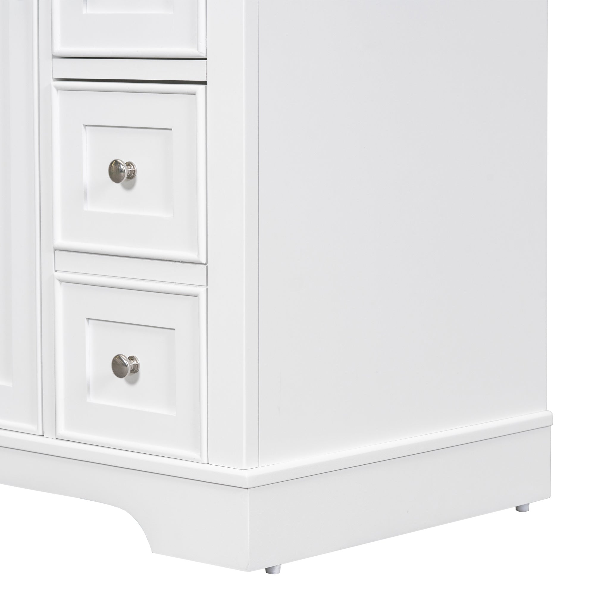 Vanity with Cabinet & Drawers & Shelf -Considering the humid environment in bathroom, this bathroom vanity has ample enclosed storage spaces: one cabinet with door, three drawers with slide rail each side (the top middle one drawer is for decoration use only), and adjustable shelf in the cabinet. You can put soaps, towels, shampoos, tissue paper and other bathroom essentials in it so to keep them away from dust.