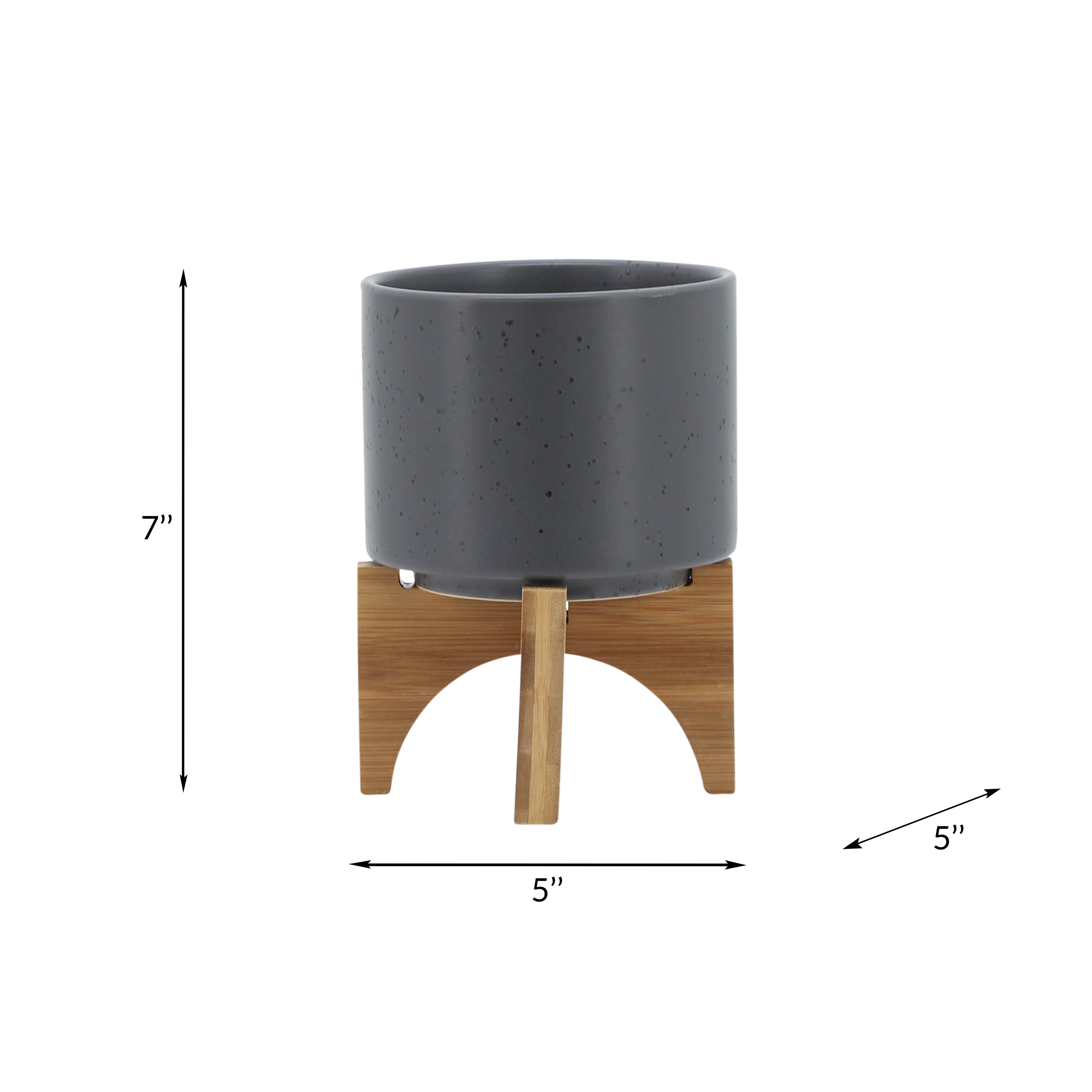 5" Planter with wood stand, Matte Gray. Beautiful Ceramic planter, black speckles on planter. Bottom of planter has a rubber wood coaster.Sagebrook Home has been formed from a love of design, a commitment to service and a dedication to quality. They create and import fashion forward items in the most popular design styles. Backed with years of experience in the textile field, They are now providing a complete Home decor story. the combination of wall decor, furniture, lighting and Home accessories are all coordinated with textiles to provide a complete Home look. Sagebrook Home is committed to providing the best Home decor and accent pieces at value prices.