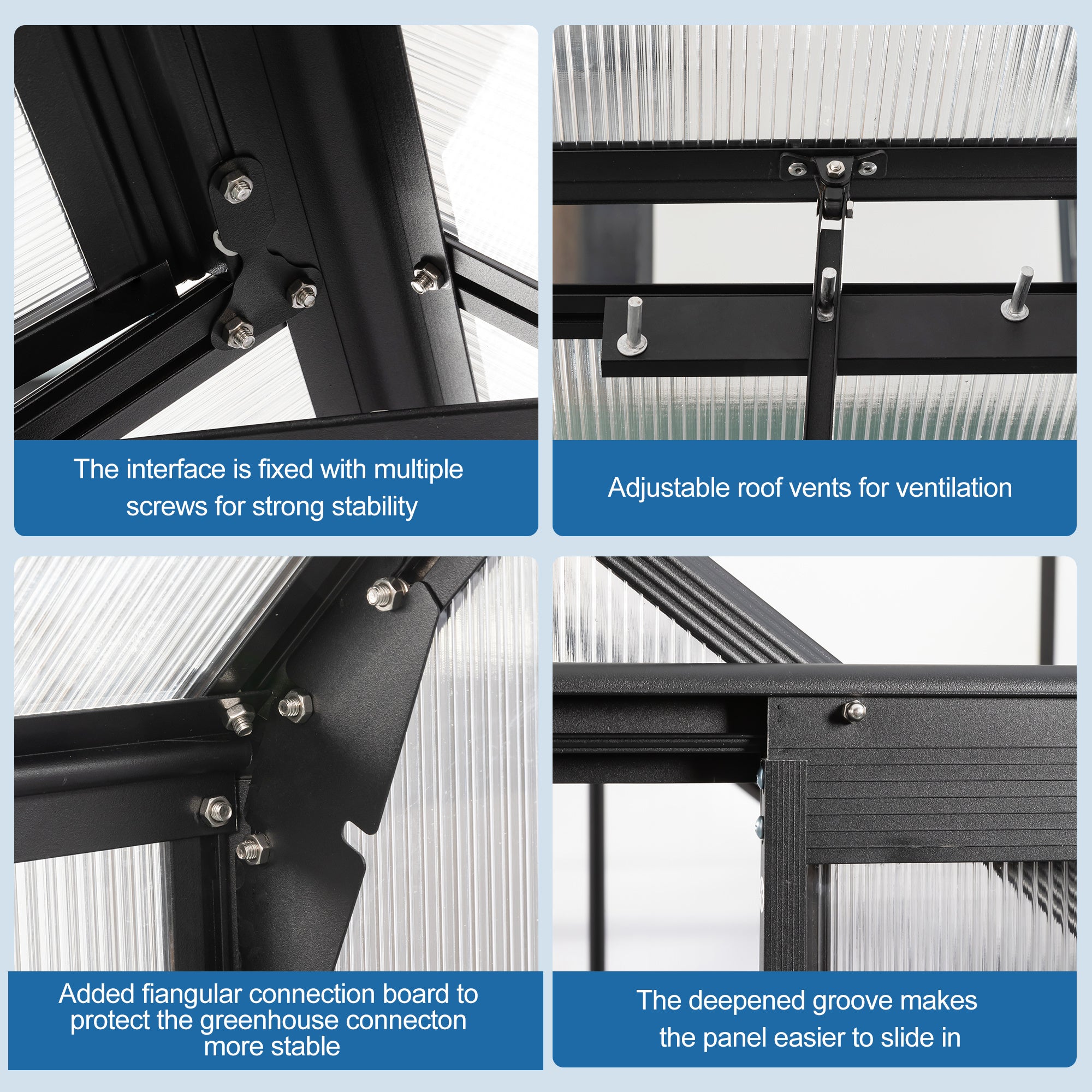 [Heavy-duty & Durable Frame]The 4mm thick polycarbonate board can withstand outdoor temperature from -20℃ to 70 ℃, allowing enough sunlight to pass through and isolating most UV rays. The aluminum alloy frame with powder coating is more durable, won't get rust. The panels allow up to 70% light transmission for optimal plant growth while blocking out over 99.9% of harmful UV rays.