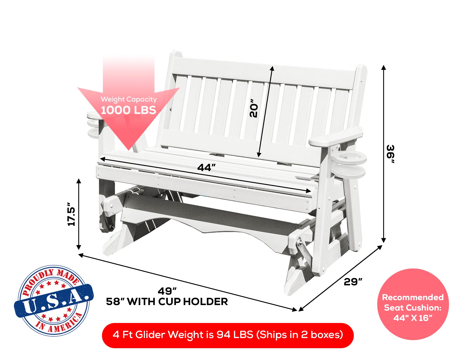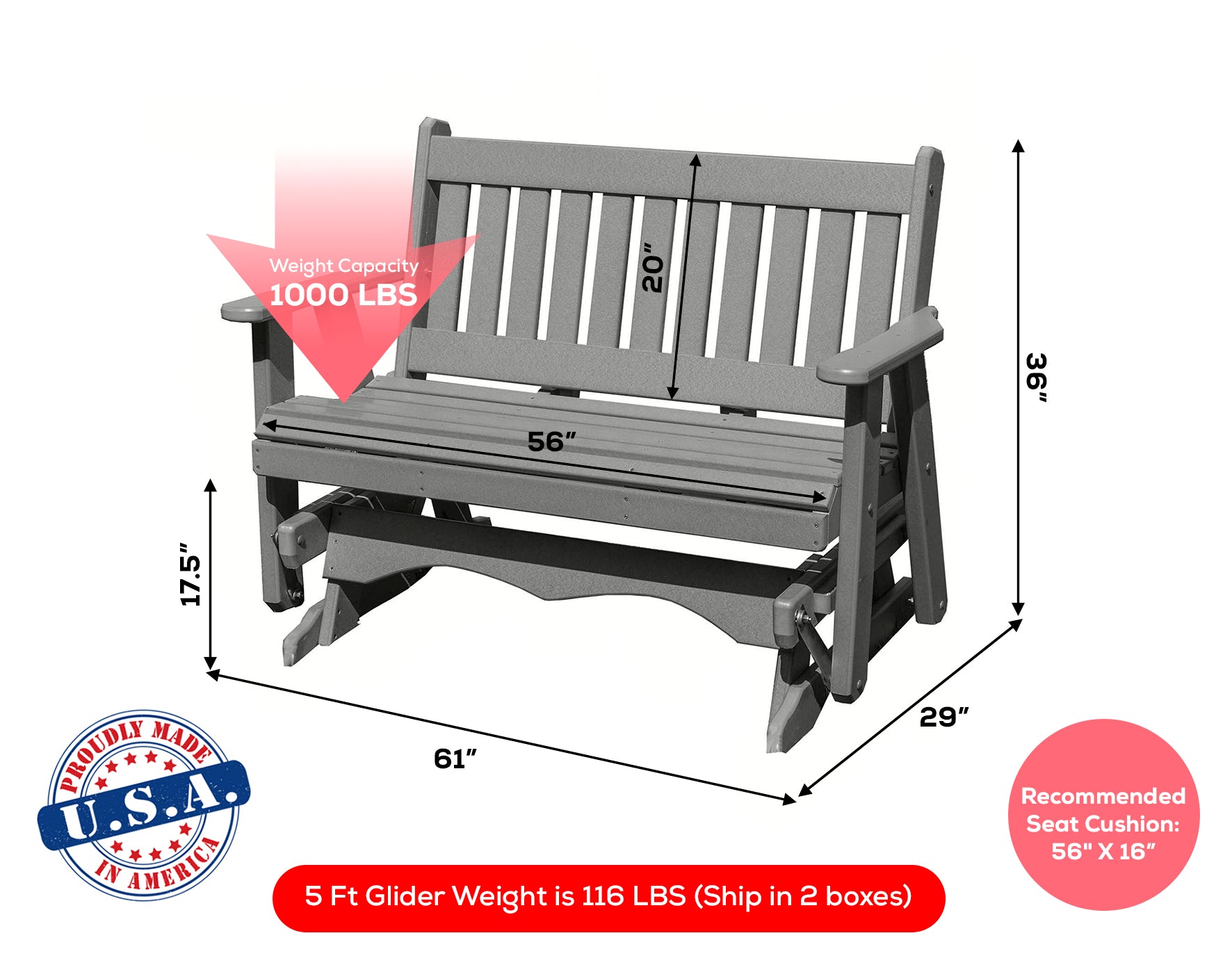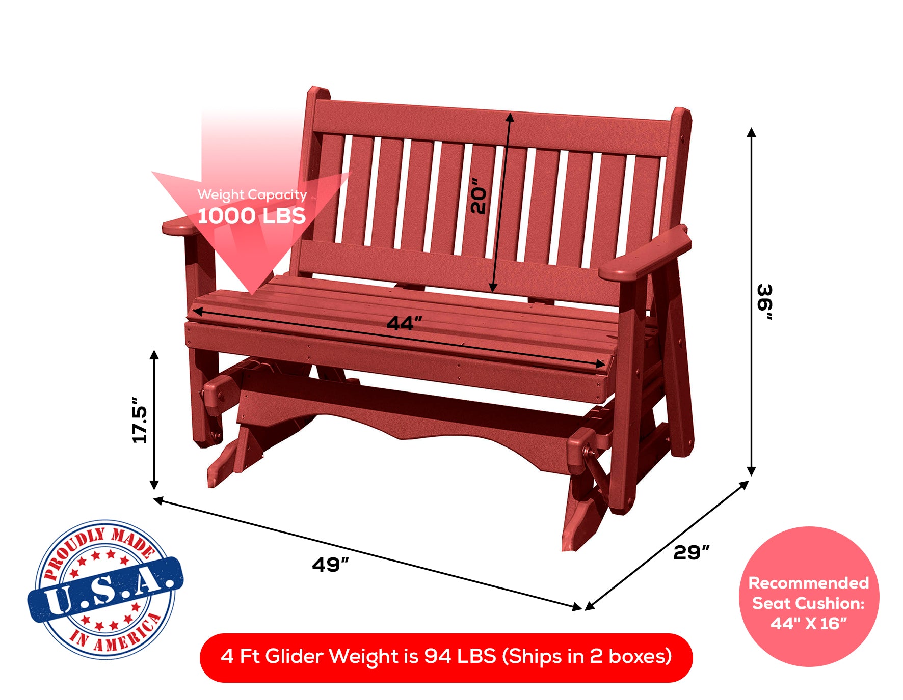 • Handcrafted Quality - Each glider is meticulously handcrafted by skilled Amish artisans in Pennsylvania, using time-honored techniques and high-quality materials. The result is a unique and heirloom-quality piece that will be cherished for generations.