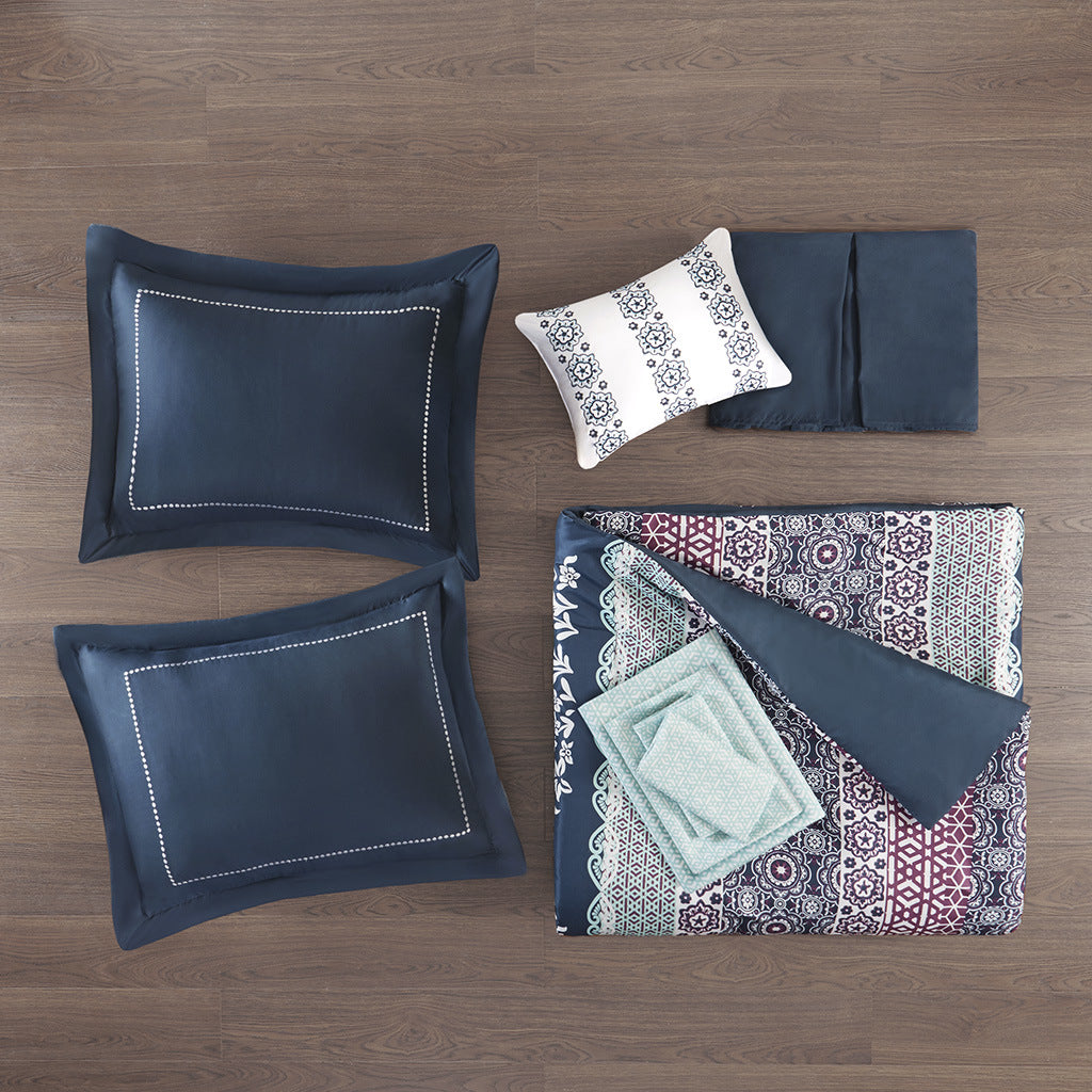 Set includes comforter, bedskirt, 2 shams (1 in Twin or Twin XL), 1 oblong pillow, flat sheet, fitted sheet, bedskirt, and 2 pillowcases (1 for Twin or Twin XL)