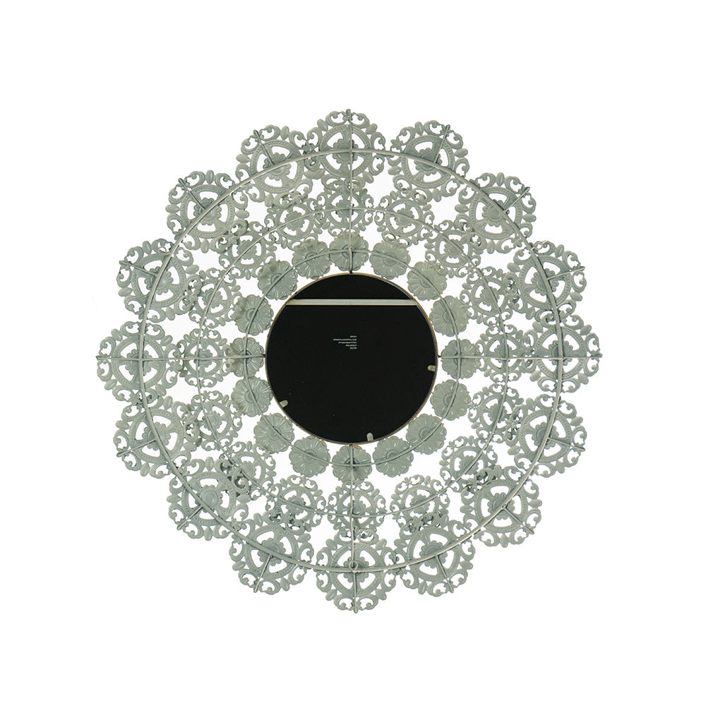 A round mirror is surrounded by wrought iron scrollwork with additional floral elements in softly painted shades of blue, green and ivory.