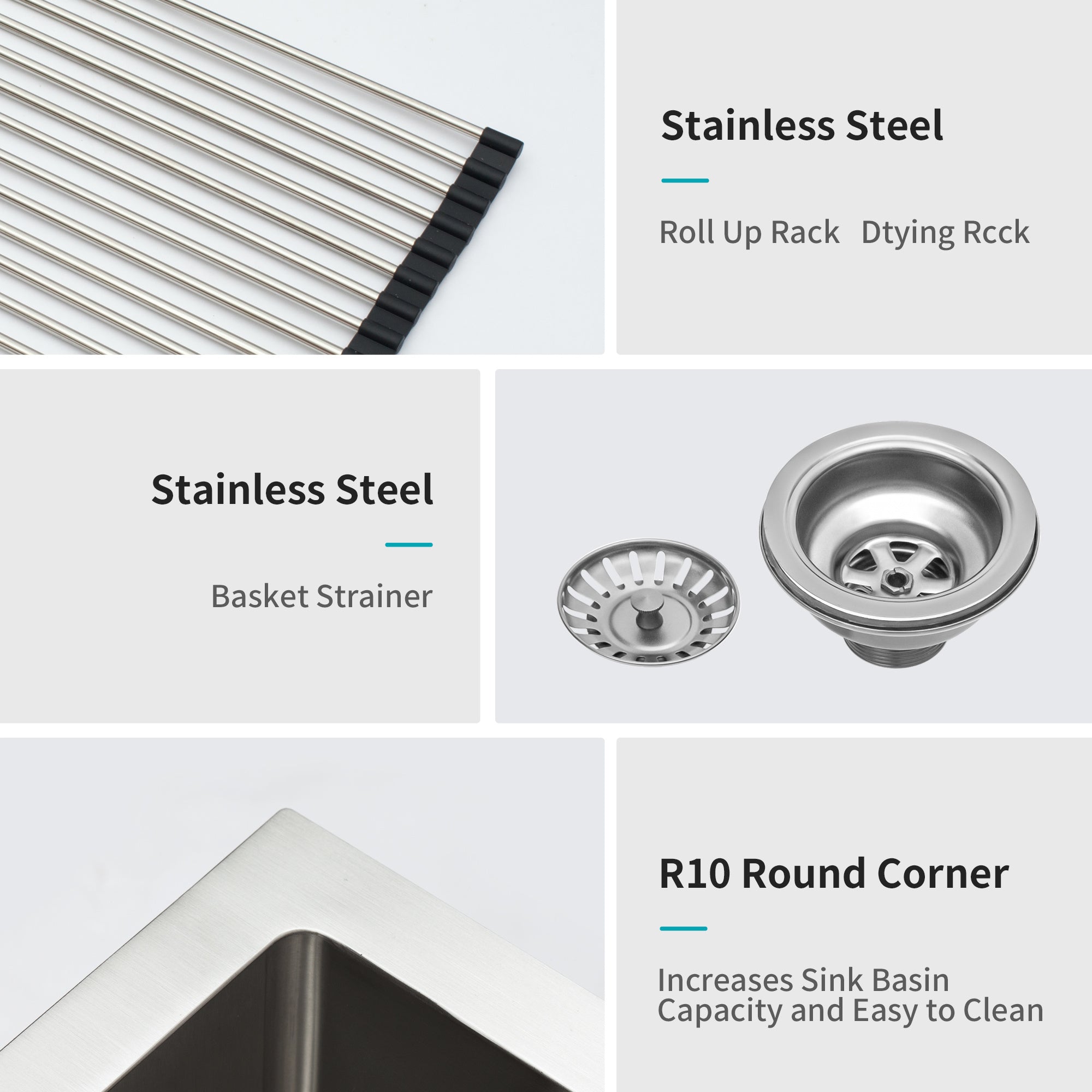 [Drain Easily, Sound Proof]The X-shaped water guide allows the water to flow down more smoothly, making the sink easier to clean and maintain its beauty.R10 rounded corner design provides more working space and avoids food residue.