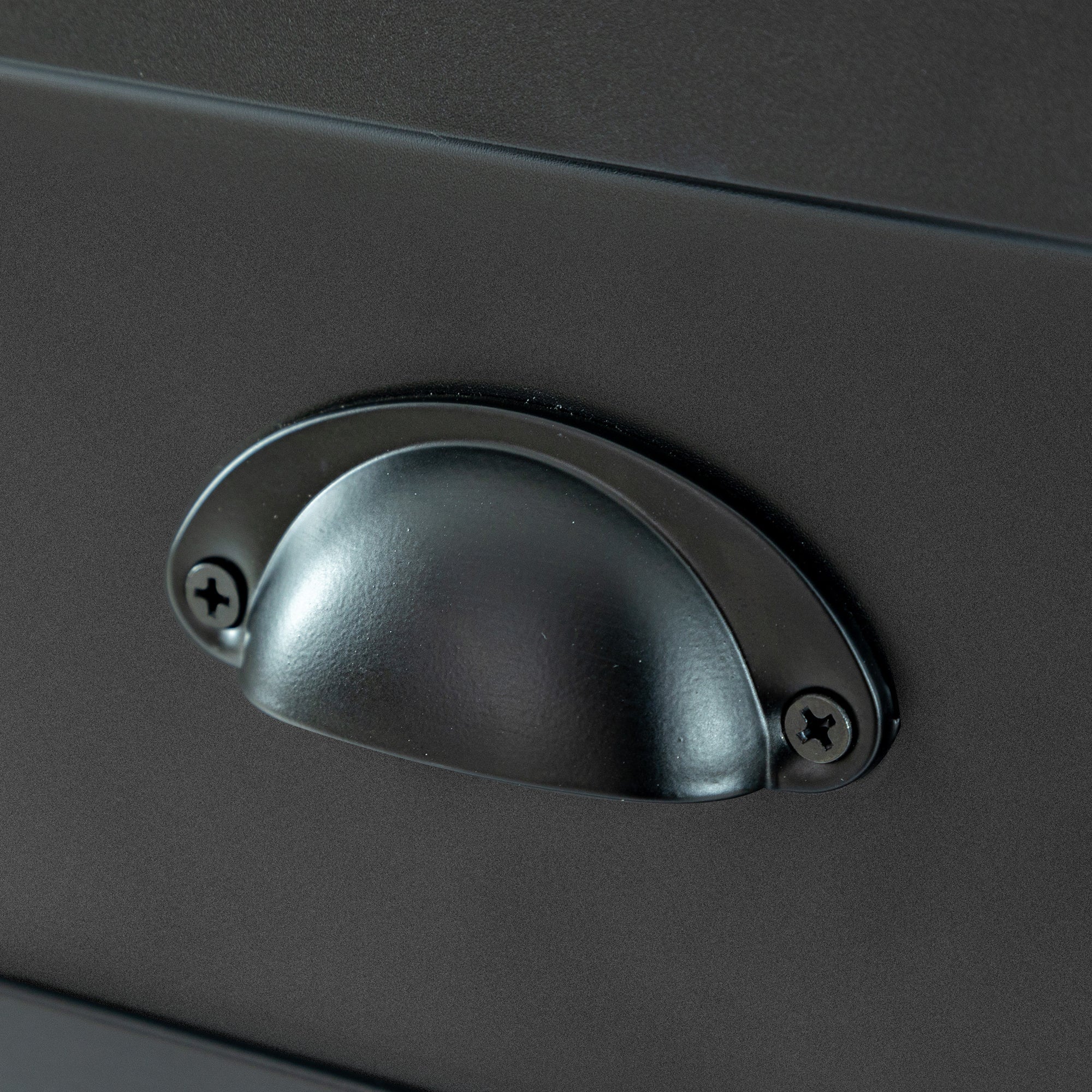 Three-in-one dowel joint, solid wood frame, 25 mm thick joinery board for the roof, drawer panel for 15 mm thick density board, plastic shape, with black shell-shaped handle.