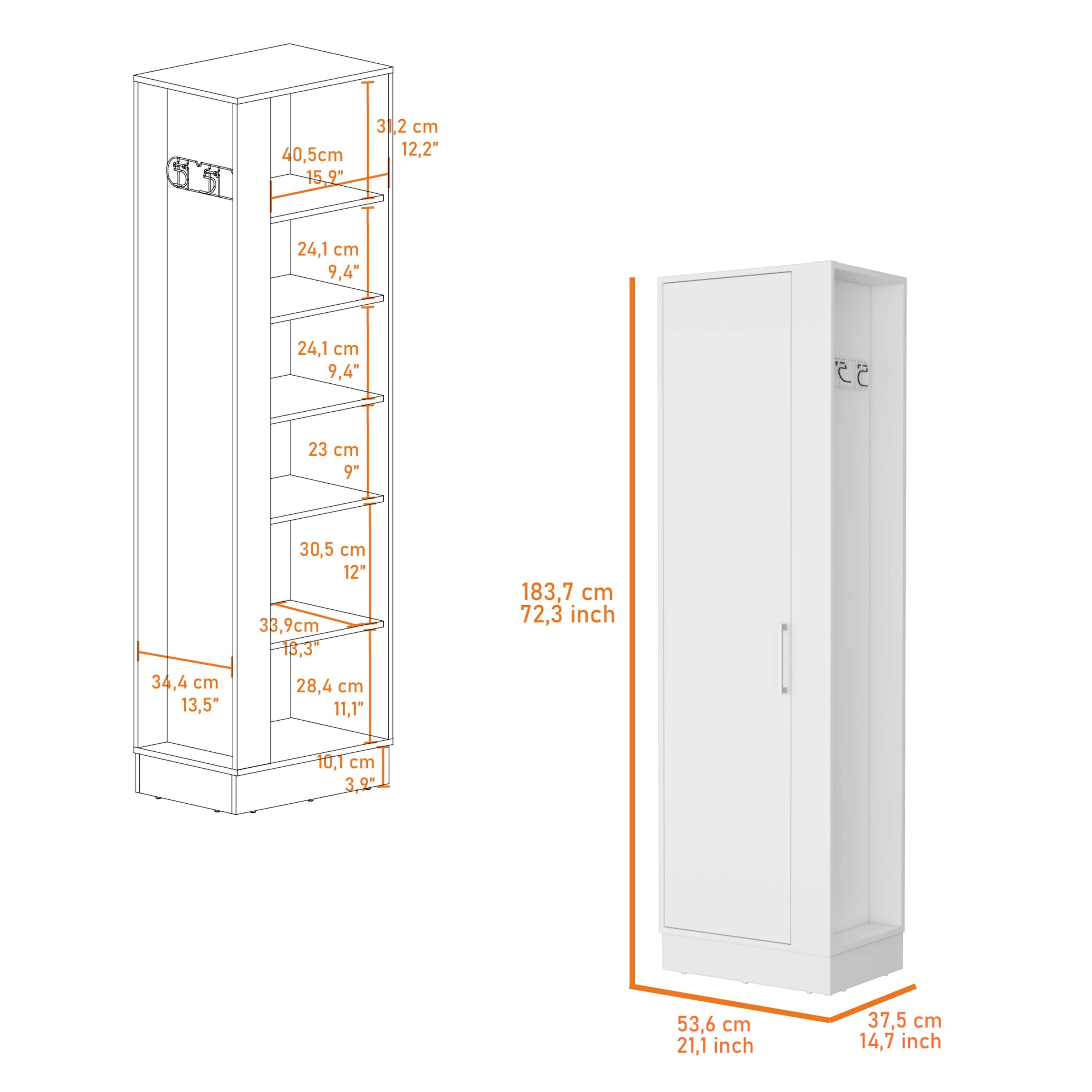 Set includesOne (1) tall cabinetFinish colorWhiteMaterialsManufactured WoodProduct dimensions72.32"H x 21.1"W x 14.76"DNumber of doors2Number of shelves6