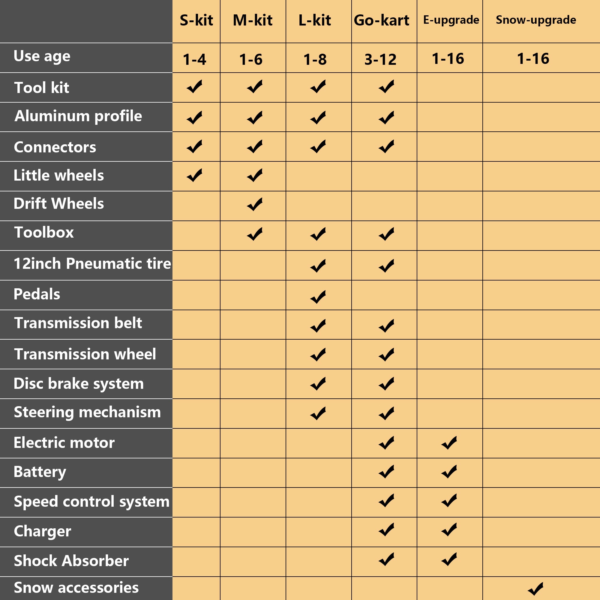 FeaturesLife-size Modular ToyThis product is designed by a young team in a diversified technology company. Technically, it's an innovative modular toy, but in life-size. Such an interesting product can infinitely provoke children's imagination and creativity, stimulate their brain development.Improve Parent-child BondingThe manual that comes with this product marks out the assembly methods for children of different ages. Parents can assemble and play with their children to enjoy fun experiences. All kinds of fun and outdoor equipment that children of different ages enjoy can be assembled. Environment-friendly MaterialsThis product is made of high-strength aviation aluminum alloy profiles and high-strength BASF PA66 eco-friendly nylon plastic connectors, and polymer rubber cushion. Also included are oversized pneumatic tires, fiberglass reinforced drive belts, and mechanical disc brakes. Diverse Application ScenariosThis product adopts simple modular design, easy for users to use and manage it, and to make more creative new combinations on this basis. Kits with different modules can be assembled into at least 15 different electric toys. Suitable for most outdoor sports scenes, such as land, water, ice and snow venues, etc.Upgradeable modular Design InterfaceDue to the modular design philosophy of this product, it can be upgraded to a higher level state at any time by adding upgrade packages. Scooters, bikes, trailers, and go-karts can also be upgraded to electric mode, or more electric motors can be used for more power. The product can be applied to almost all minors. Patented Electric ModuleThis product contains DC18V500W brushless motor module, output powerful power, internal special design, has multiple protection, to ensure high performance and high durability. And the 18V32Ah lithium battery module provides continuous power for the vehicles. (This product can be used as battery module for DEWALT power tools. )