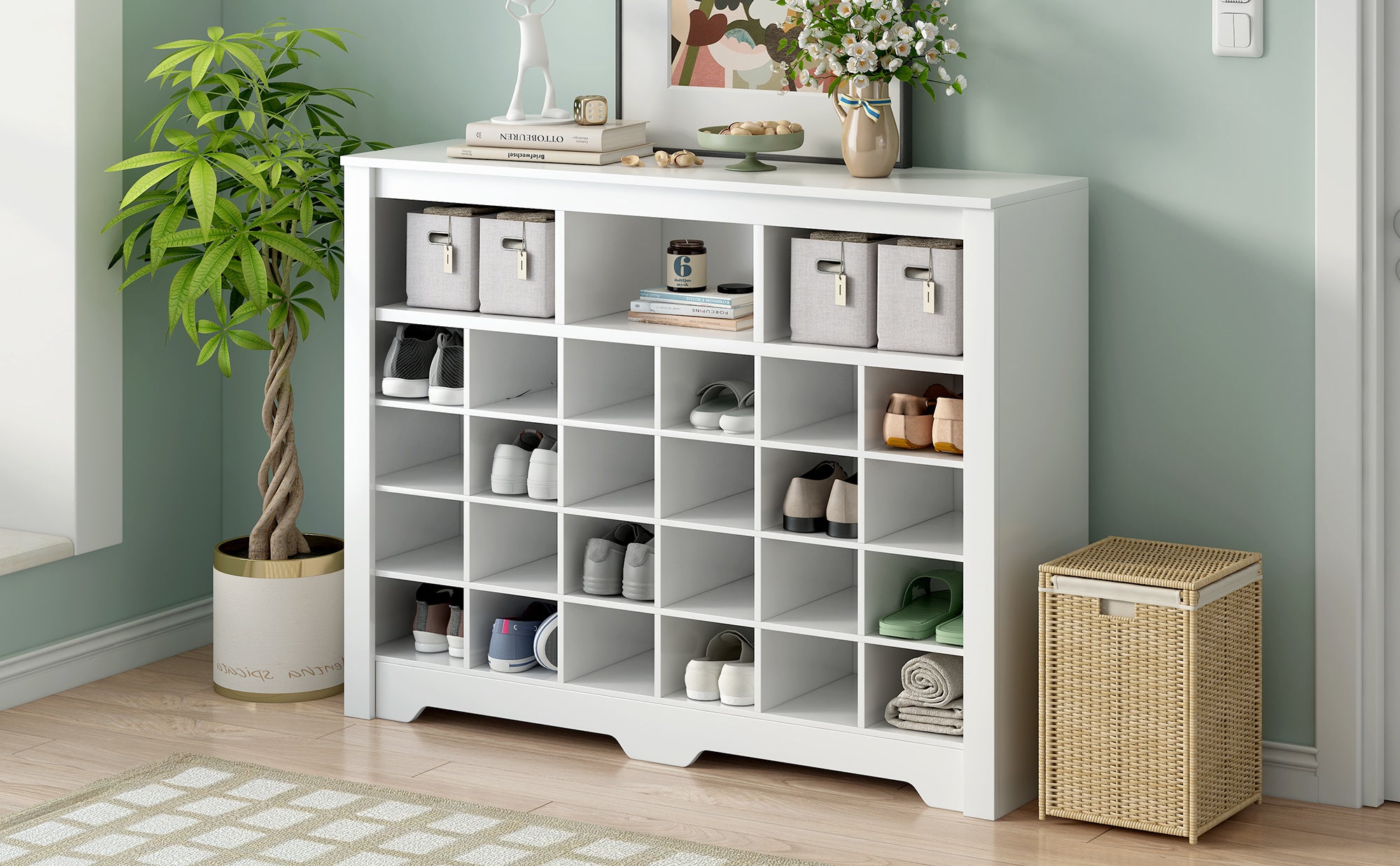 The cabinet is divided into 24 small cubbies, each designed to hold a single pair of shoes, ensuring that your shoes are neatly organized and easily accessible.