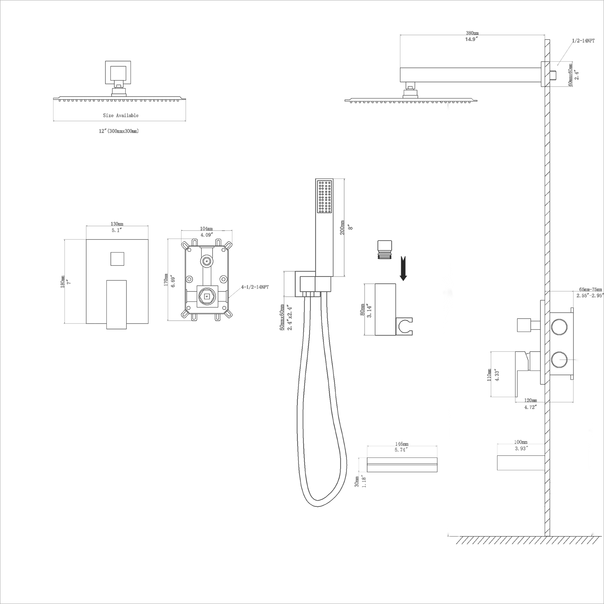 {Included Components}12 inch Square rain shower head,Shower Arm, handheld shower head,tub spout,59" shower hose,shower holder, water control valve,Parts and installation instructions.