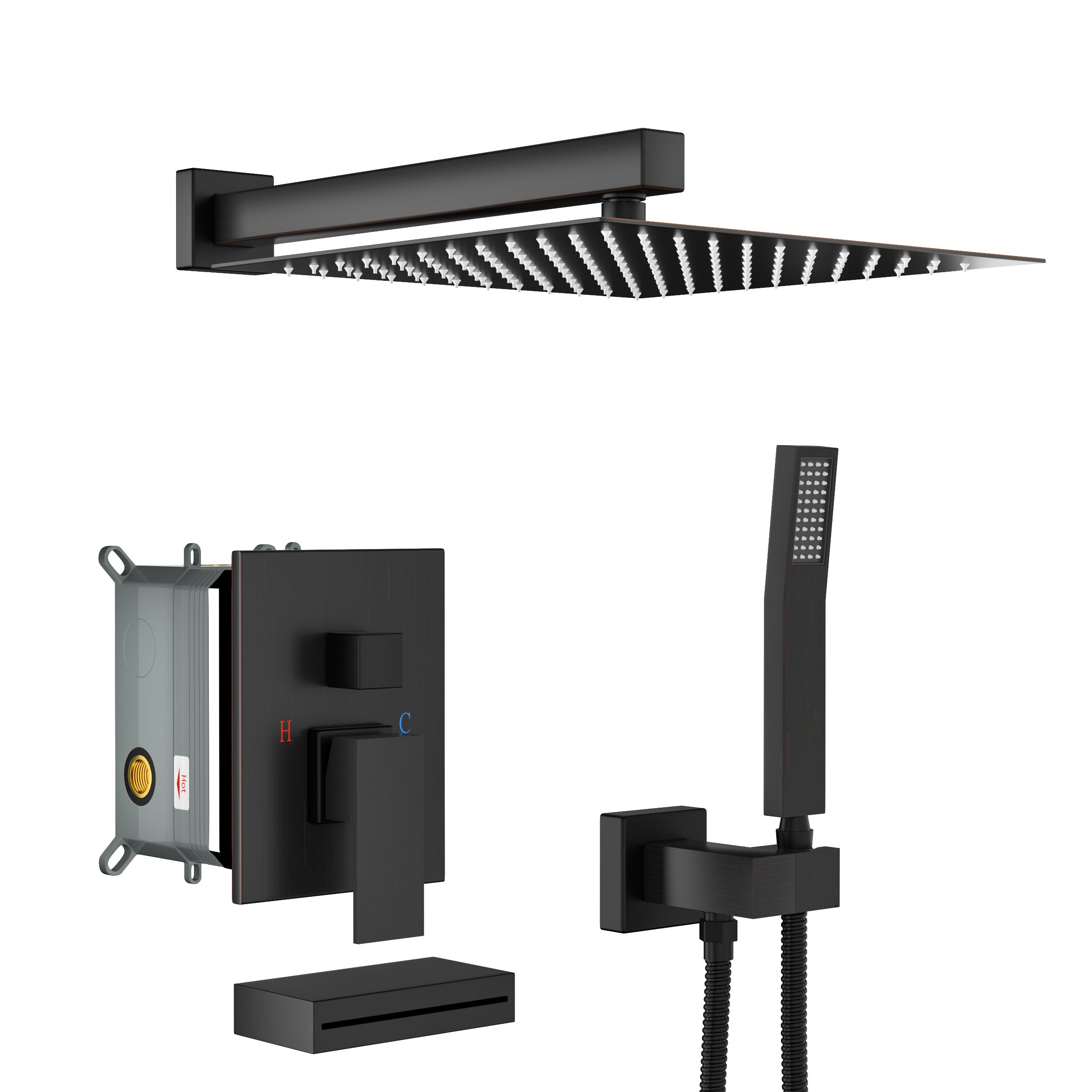 {3 Function Shower System}Our shower system with tub spout, overhead rain shower head and handheld shower, can adapt to your different needs. The Waterfall Tub Spout with larger water output faster to filled up your bathtub quickly,reduces temperature loss and save your time.12" rainfall shower head brings full-body high pressure showering, handheld shower with 59" hose gives your free movement showering.