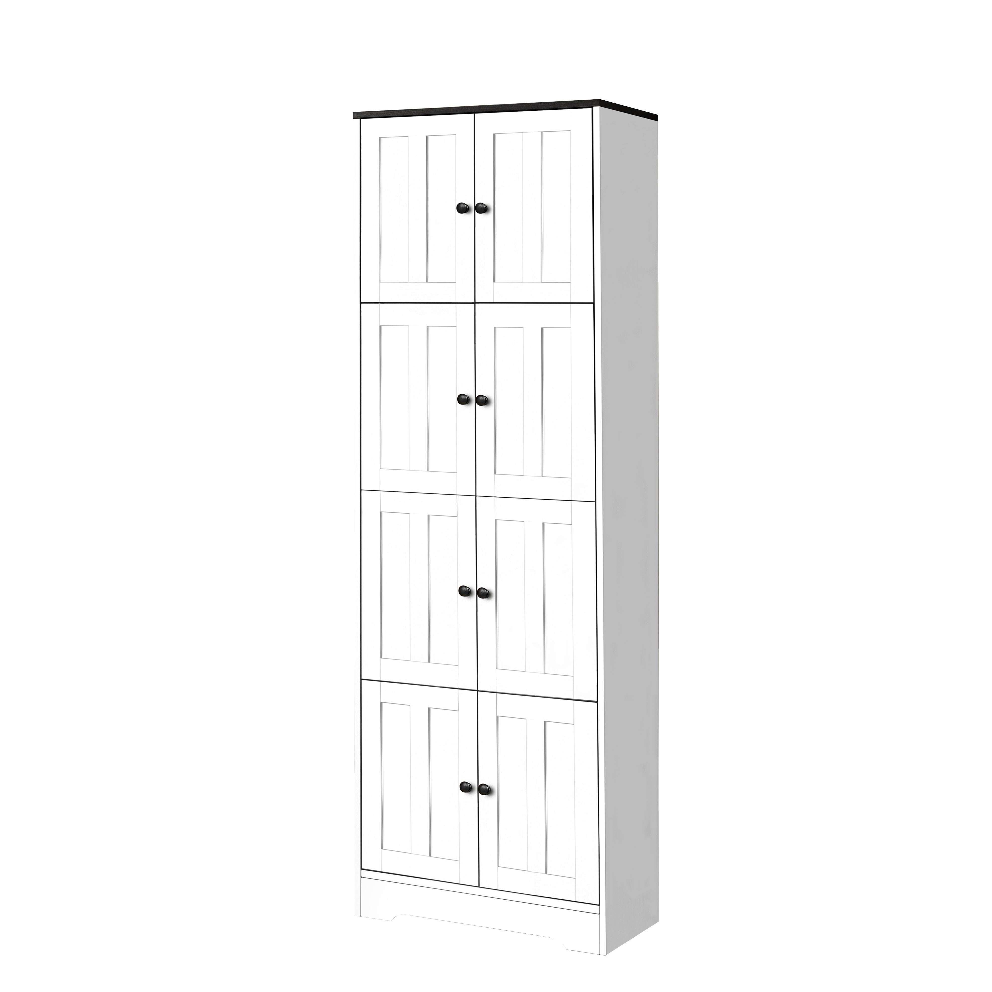 KEEP ESSENTIALS ORGANIZED: Equipped with 4 individual compartments which offer large storage capacity, helping you create a mess-free environment to keep the essentials organized.Each compartment has independent doors which are more convenient to take out or put in stuff.MEET MULTI-PURPOSE: The chic white surface is decored with neat lines design, providing a modern and chic storage cabinet for your exquisite home. Measure 24"(L) x 12.8"(W) x 72.4"(H), this size is also an ideal choice for small spaces like garages, kitchens, or bathrooms to add a clever storage solution. Large capacity but take few rooms.STURDY CABINET: Constructed with engineered wood for ease of assembly, this corner room organizer is offered with a white or walnut paint finish to compliment any room of your home.To keep clean, use a damp cloth (no chemicals please!) to wipe away dust and debris from the corner cabinet.