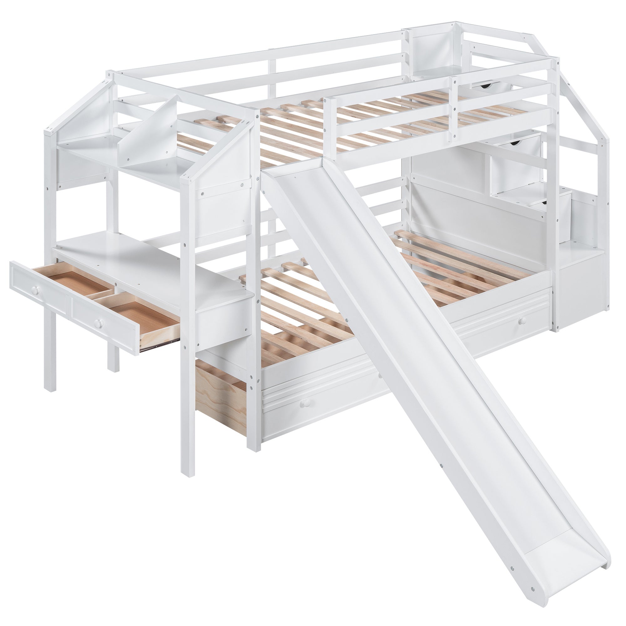 [Multifunctional Desk] This bed comes with a multifunctional desk and is a great place to study and work. The desk comes with two drawers for school supplies, and above the desk are shelves, if you sleep on the upper bunk, then this shelf design you will definitely like.